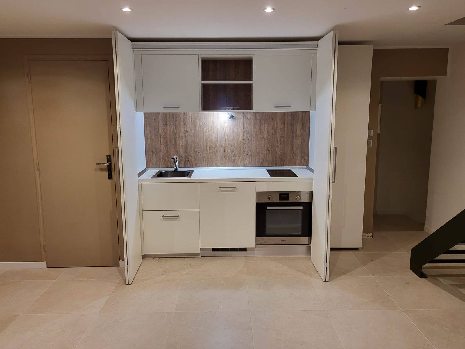 Une fois refermée, cette petite cuisine escamotable installée à Bandol est dissimulée en toute discrétion derrière deux façades qui s'apparentent visuellement à deux portes de placard sobres et modernes de faible emprise.
