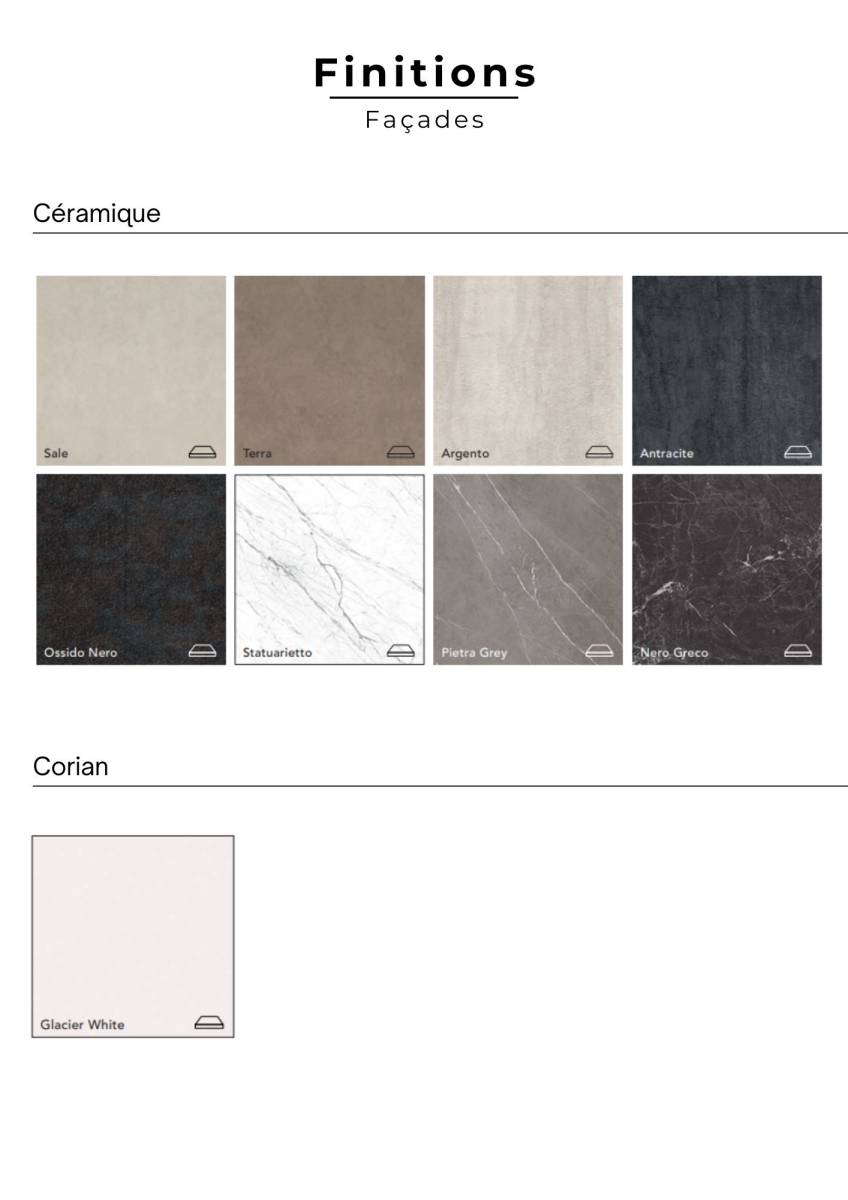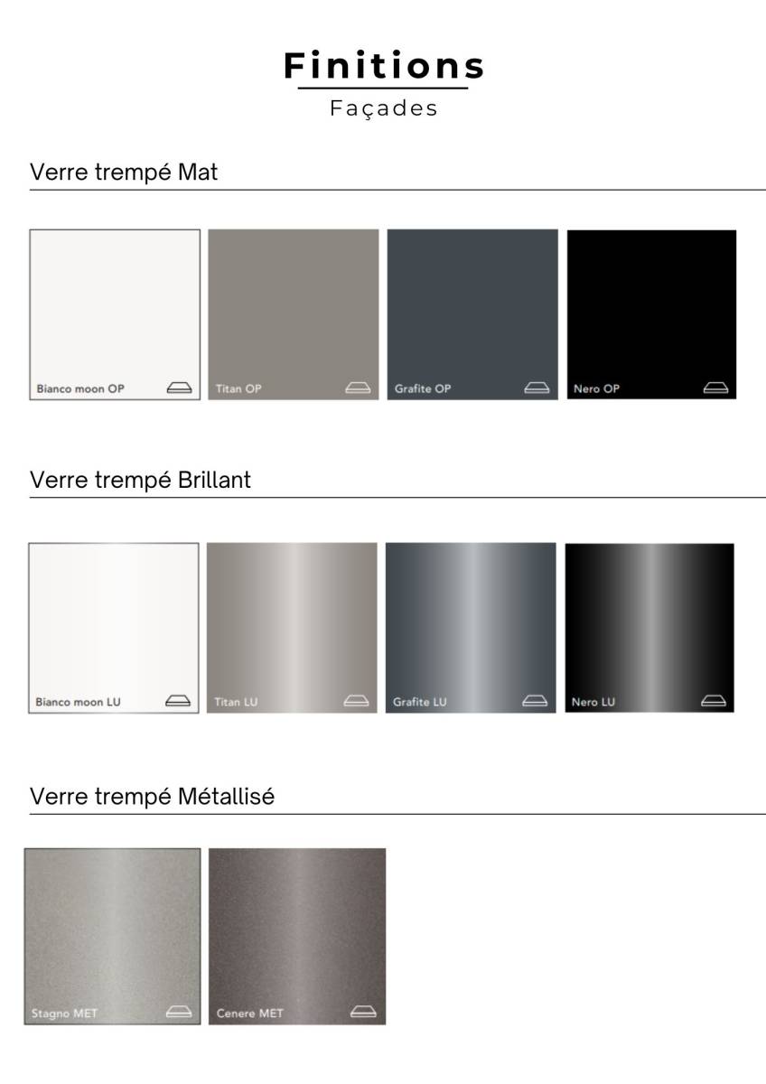 Portes avec cadre aluminium anodisé avec un large choix de revêtements d'une grande sophistication, tels que le verre trempé mat, le verre brillant, le verre métallisé, le Corian, le Grès, déclinés dans un panel de coloris modernes et raffinés.